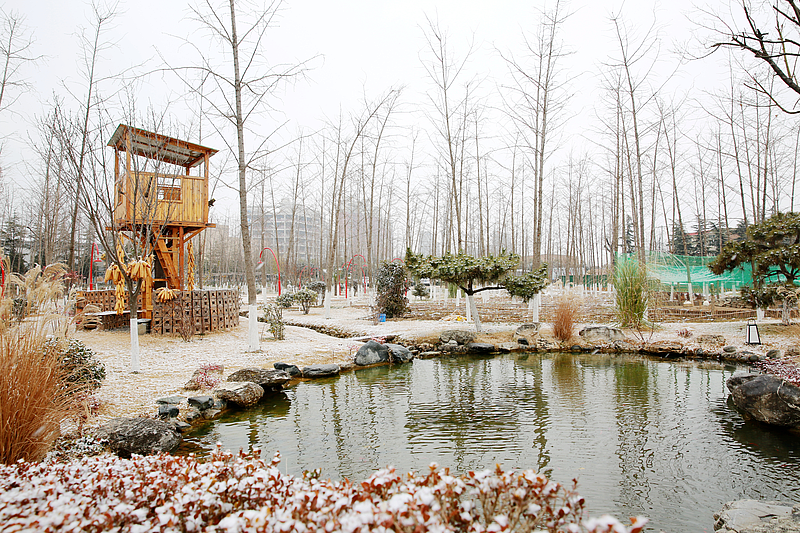 靈動淡雅、寧靜通幽。極簡的色彩、瀟灑寫意的線條,雪中的園區,好似一幅水墨畫。風聲梢捎,平添幾分生動與靈性。