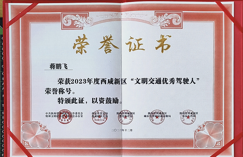 今年7月以來,西咸新區黨工委文明辦、市公安局西咸新區分局、西咸新區教育體育局、西咸新區城市管理和交通運輸局、西咸新區基層工作部等部門在全區聯合開展2023年度“文明交通示范集體和先進個人”創建評選活動。經評審,灃西集團投資公司全資子公司—西咸新區大城物聯科技服務有限公司(以下簡稱“大城公司”),榮獲“文明交通示范企業”榮譽稱號,員工曹志杰榮獲“安全管理先進個人”榮譽稱號,朱華鋒、蔣鵬飛榮獲“文明交通優秀駕駛人”榮譽稱號。
