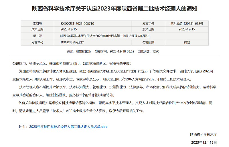 12月15日,陜西省科學技術廳發布了關于認定2023年度陜西省第二批技術經理人的通知,灃西科創&MIC7人通過認定。