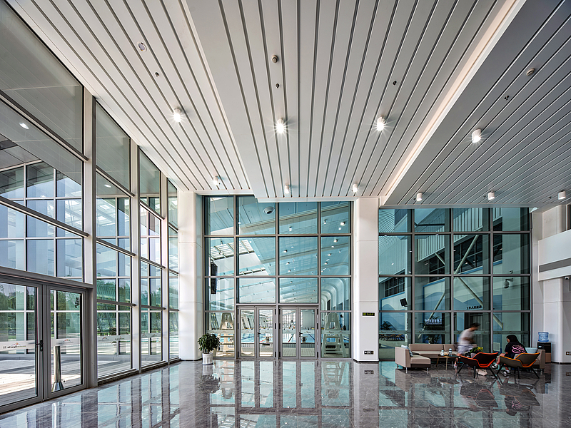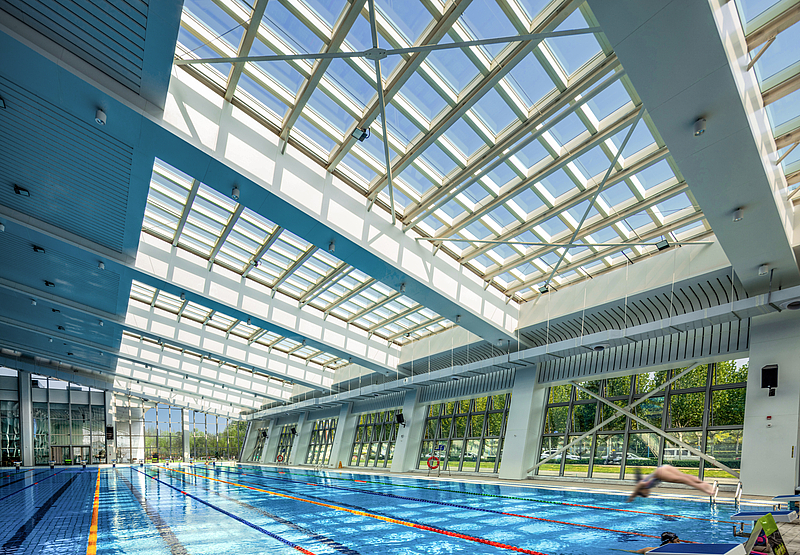 游泳館堅(jiān)持“被動(dòng)技術(shù)優(yōu)先、主動(dòng)技術(shù)優(yōu)化”設(shè)計(jì)理念,巧妙利用建筑供暖系統(tǒng)、裝配式夾芯保溫復(fù)合板系統(tǒng)、主動(dòng)遮陽(yáng)系統(tǒng)等技術(shù),確保游泳館恒溫舒適。此外,通過(guò)雨水回收、中水回收、泳池水回用等,提高水資源重復(fù)利用率,實(shí)現(xiàn)節(jié)能節(jié)水。