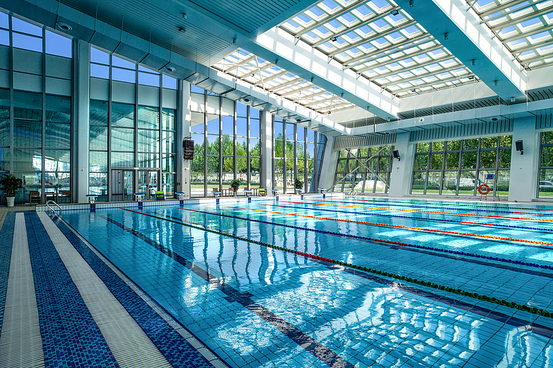 游泳館平面布局由泳池區(qū)和輔助區(qū)兩部分組成,3600平方米的通高泳池區(qū),由50米標(biāo)準(zhǔn)長(zhǎng)池(池深1.4米-1.8米)、25米標(biāo)準(zhǔn)短池(池深1.1米-1.3米)、兒童戲水池(池深0.6米)、熱水池(池深0.6米)組成,輔助區(qū)設(shè)局部二層,其中一層為泳池配套的淋浴、更衣等輔助空間,二層為2700平方米商業(yè)休閑健身中心。項(xiàng)目設(shè)1400平方米地下室,主要功能為設(shè)備層。